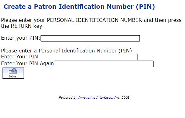 A PIN (Personal Identification Number) is a four-digit number assigned to your library card when it is first issued. Once you log into your library account online, you may replace this PIN with a password of your choosing. The password can be any combination of alphanumeric characters. These characters are case sensitive, but not restricted to any minimum or maximum length.